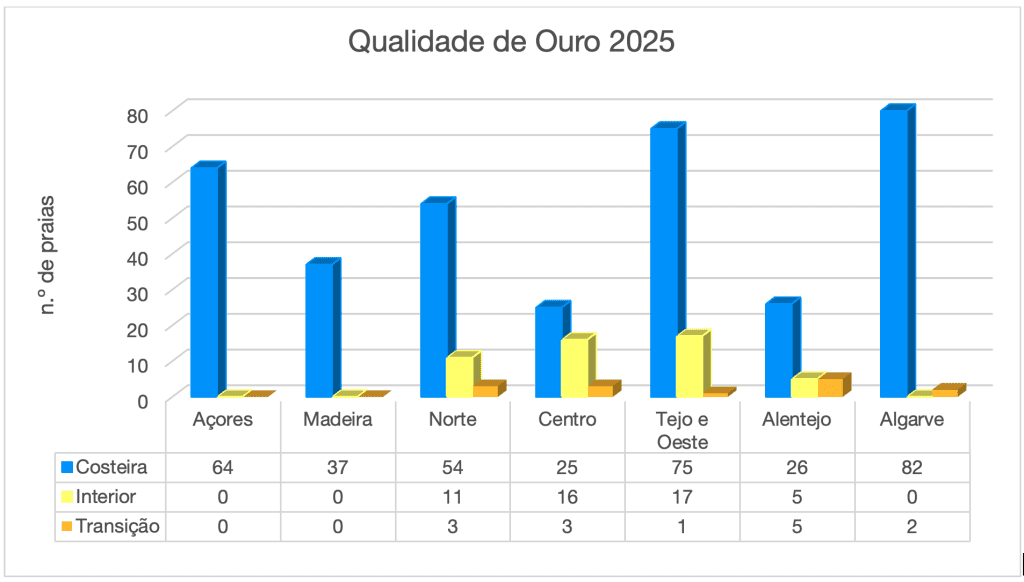 Em 2025, foram distinguidas mais 6 praias do que em 2024. Das 426 praias galardoadas, 363 são costeiras, 49 interiores e 14 de transição.